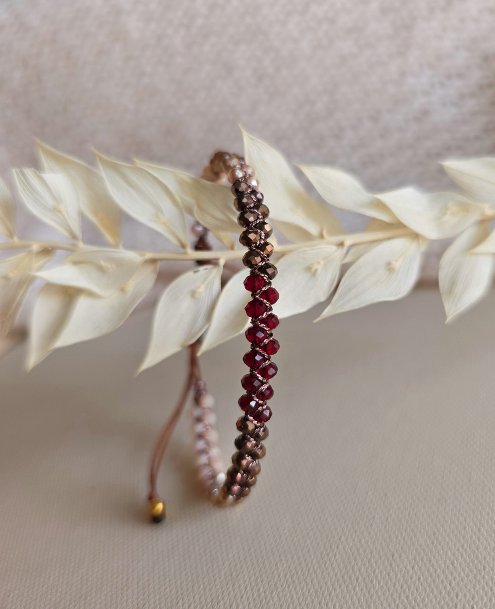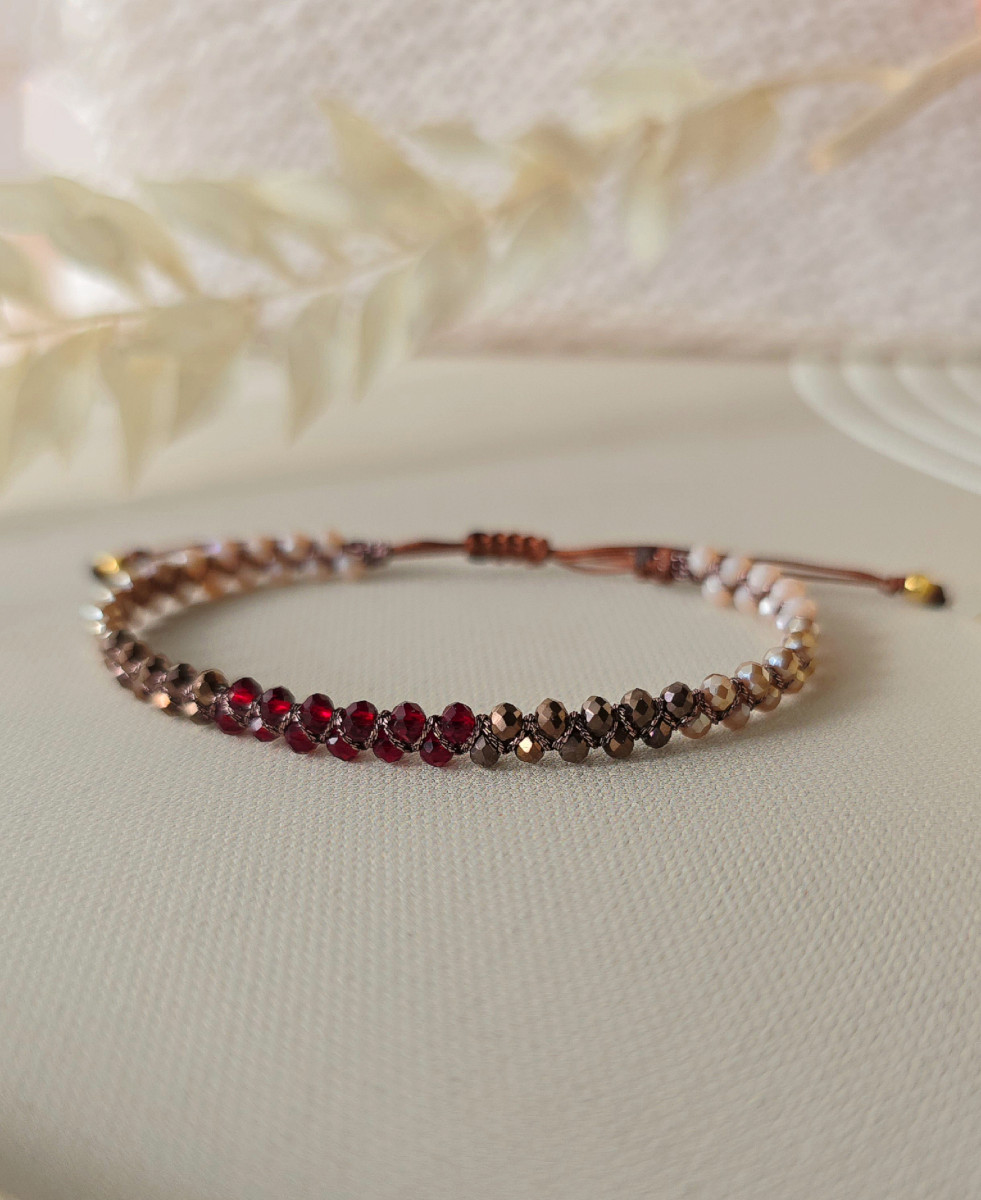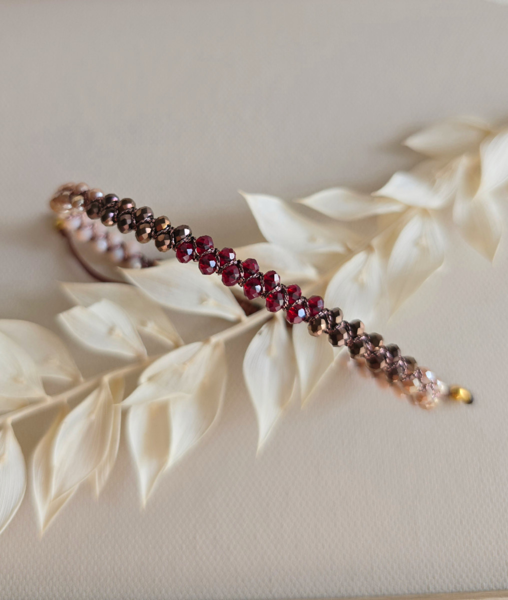 Kolorystyka została ułożona w harmonijnym przejściu ombre, od jasnych, kremowych tonów, przez ciepłe beże i brązy, aż po głęboki, nasycony bordo w centralnej części bransoletki. To płynne przejście kolorów nadaje jej miękkości i elegancji, a jednocześnie sprawia, że przyciąga wzrok.