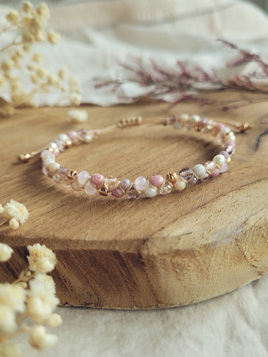 Lilac to delikatna bransoletka w stylu boho, która łączy subtelność kremowych tonów z romantycznym różem i liliowym fioletem. Jej kolorystyka jest lekka, świeża i bardzo kobieca. Bransoletka została ręcznie wypleciona na beżowym sznurku metodą dwurzędowej makramy, co nadaje jej wyjątkowej struktury i trwałości.
