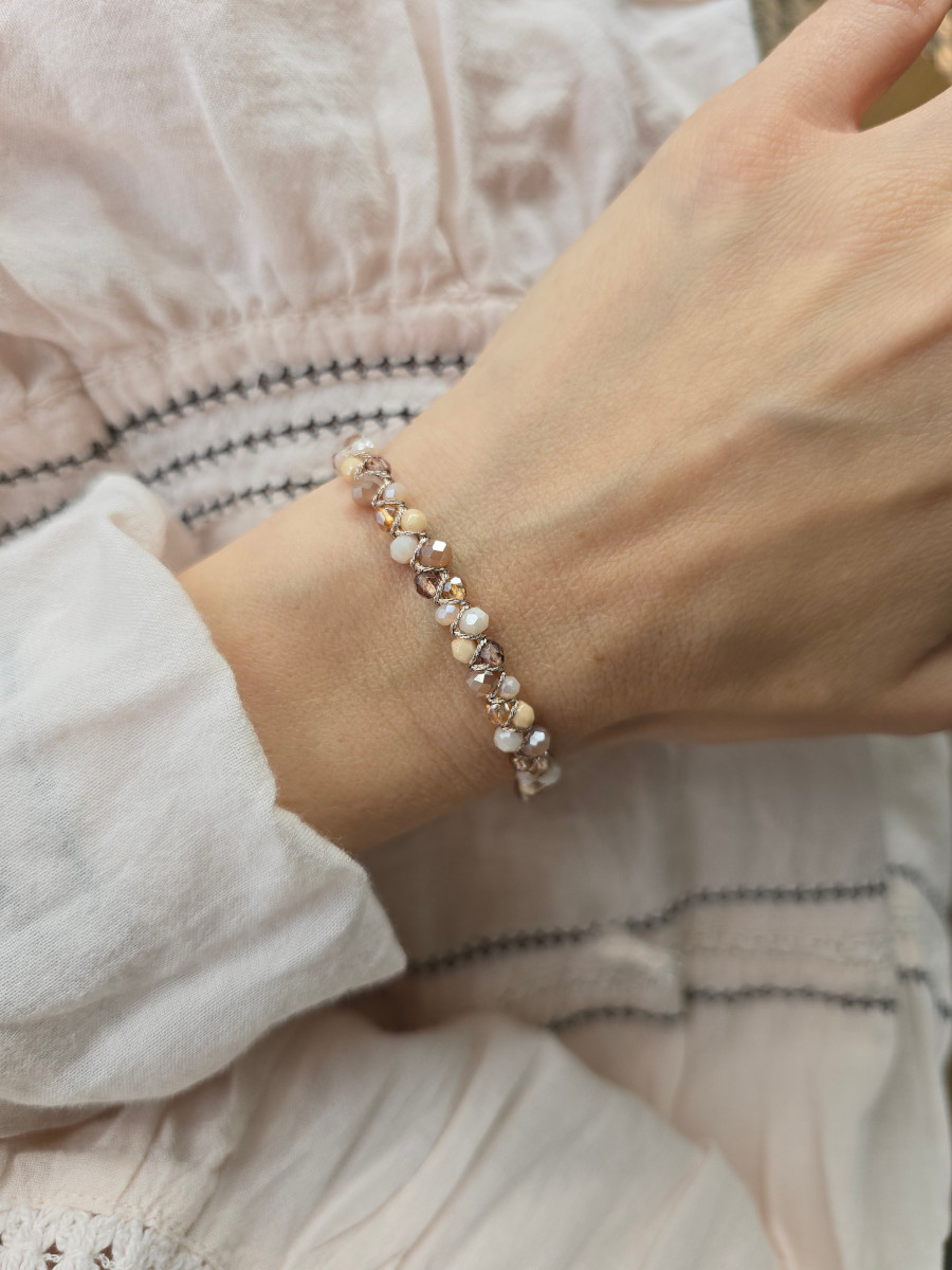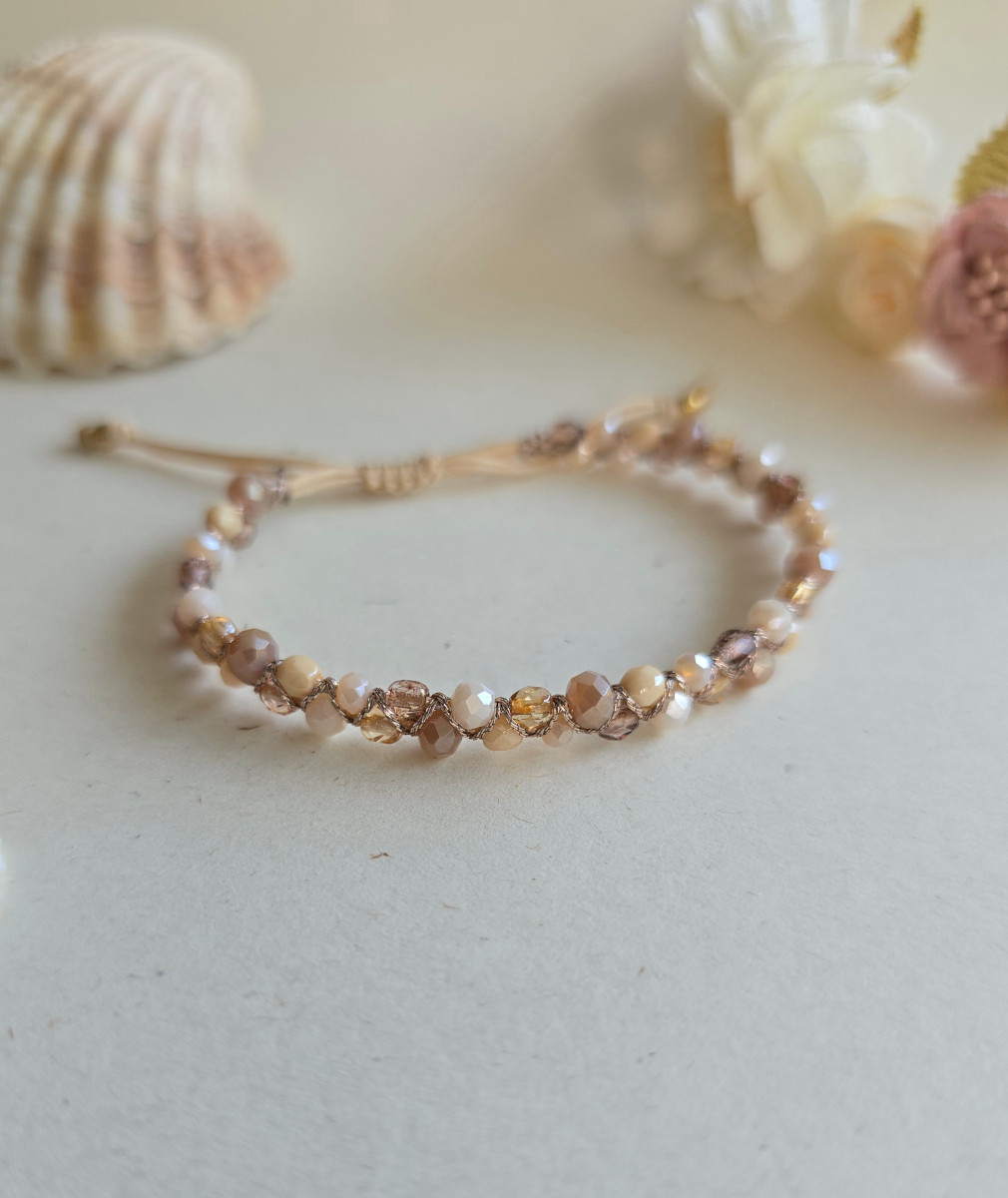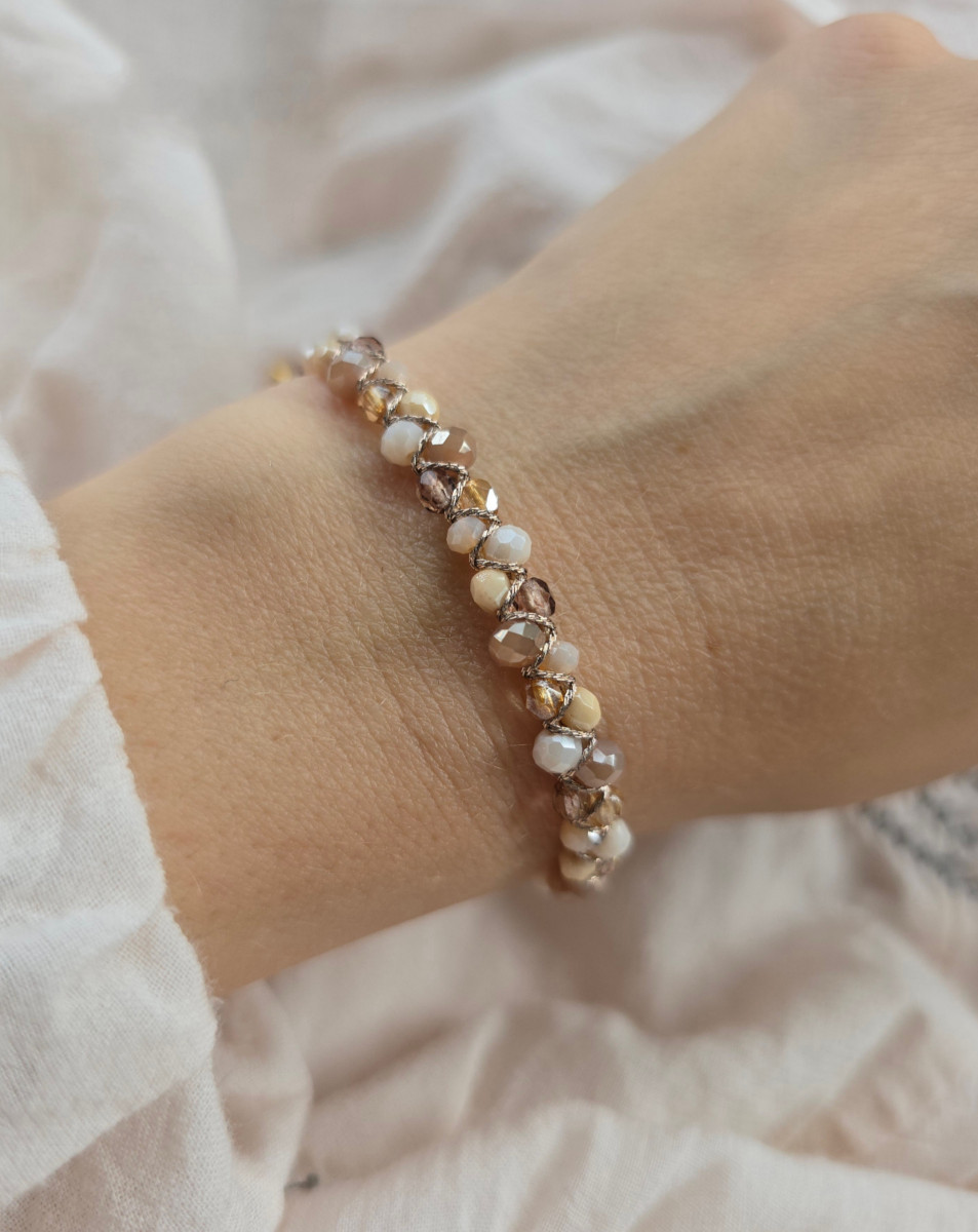 Bransoletka Sand powstała z połączenia kryształków szklanych i czeskich koralików, które zostały ręcznie zaplecione metalizowaną nić. Starannie dobrana paleta kremowych, beżowych oraz bursztynowo-brązowych tonów nadaje jej ciepły, harmonijny charakter i podkreśla delikatny klimat boho