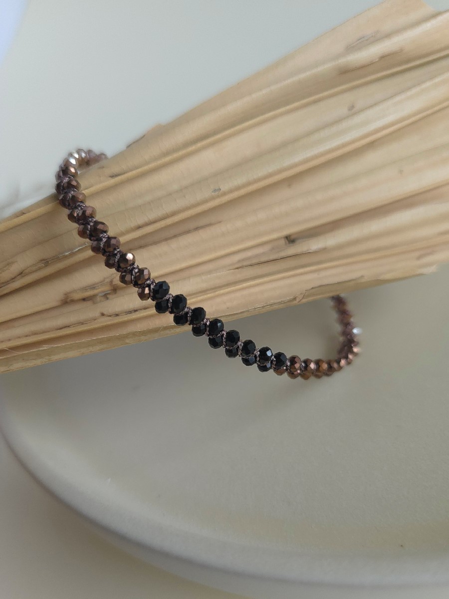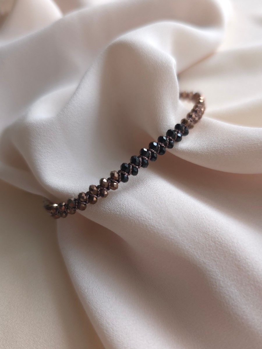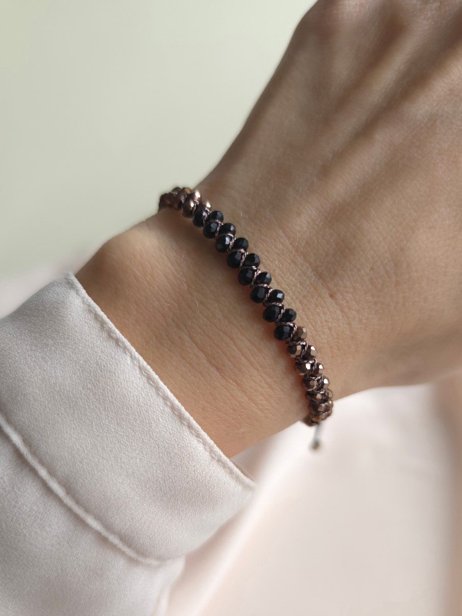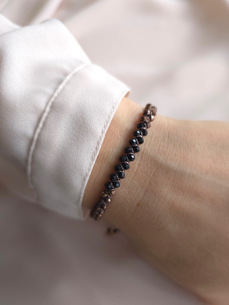 Fasetowane, szklane kryształki subtelnie odbijają światło, tworząc delikatny połysk przy każdym ruchu dłoni. Każdy z nich został ręcznie opleciony metalizowaną nicią, która stabilizuje konstrukcję i podkreśla elegancki charakter bransoletki. Całość wykończona jest czarnym sznurkiem oraz kuleczkami ze stali chirurgicznej pokrytej powłoką PVD.
