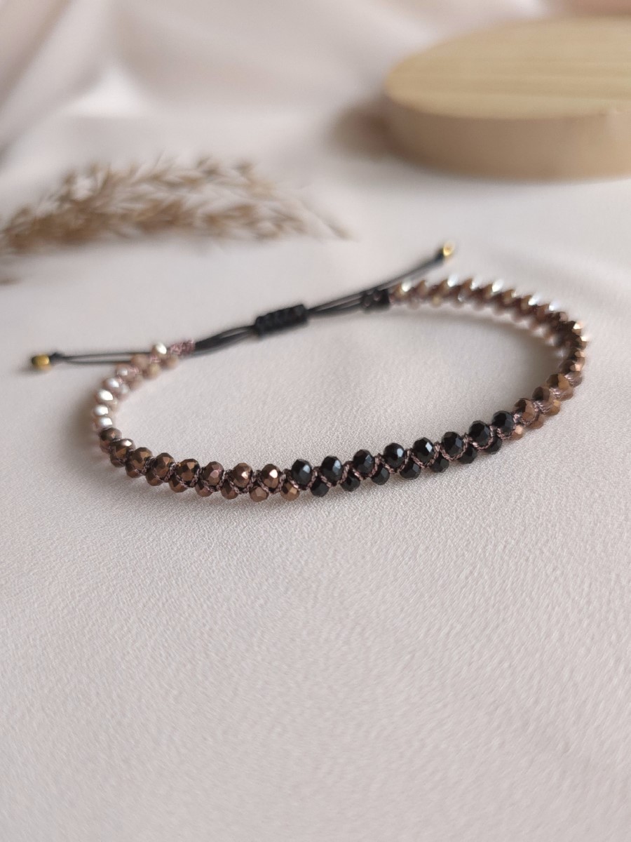 Bransoletka została wykonana ręcznie z dbałością o każdy detal. Jej kompozycja kolorystyczna opiera się na harmonijnym przejściu od ciemnego beżu, przez ciepły brąz, aż po głęboką, intensywną czerń w centralnej części. To zestawienie nadaje jej charakteru i sprawia, że mimo stonowanej palety barw przyciąga uwagę.