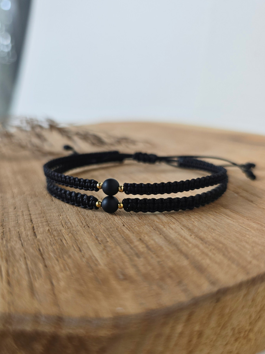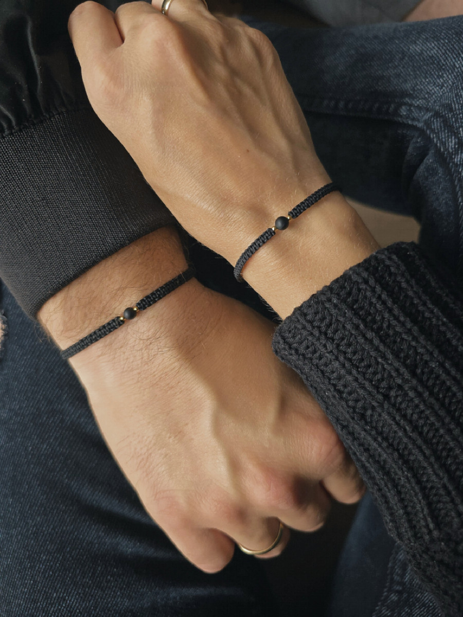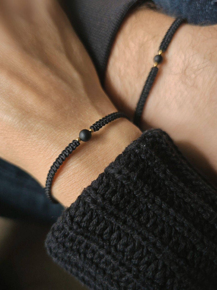 Minimalistyczny komplet bransoletek dla par, to subtelny symbol bliskości i równowagi. Każda z bransoletek została wykonana ręcznie techniką makramy i ozdobiona pojedynczą kulką czarnego turmalinu oraz złotych kuleczek ze stali szlachetnej z dodatkową powłoką PVD.