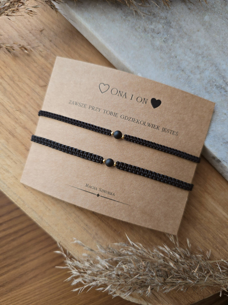 Damska wersja zachwyca bardzo delikatnym splotem, natomiast męska została wykonana na nieco grubszym sznurku. Komplet zapakowany jest na kartoniku „Ona & On” oraz w kopertę prezentową – gotowy do wręczenia jako symboliczny, osobisty prezent.