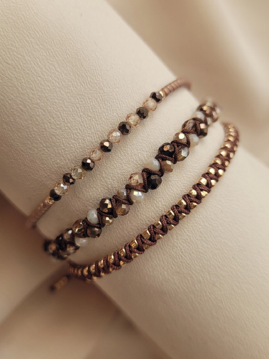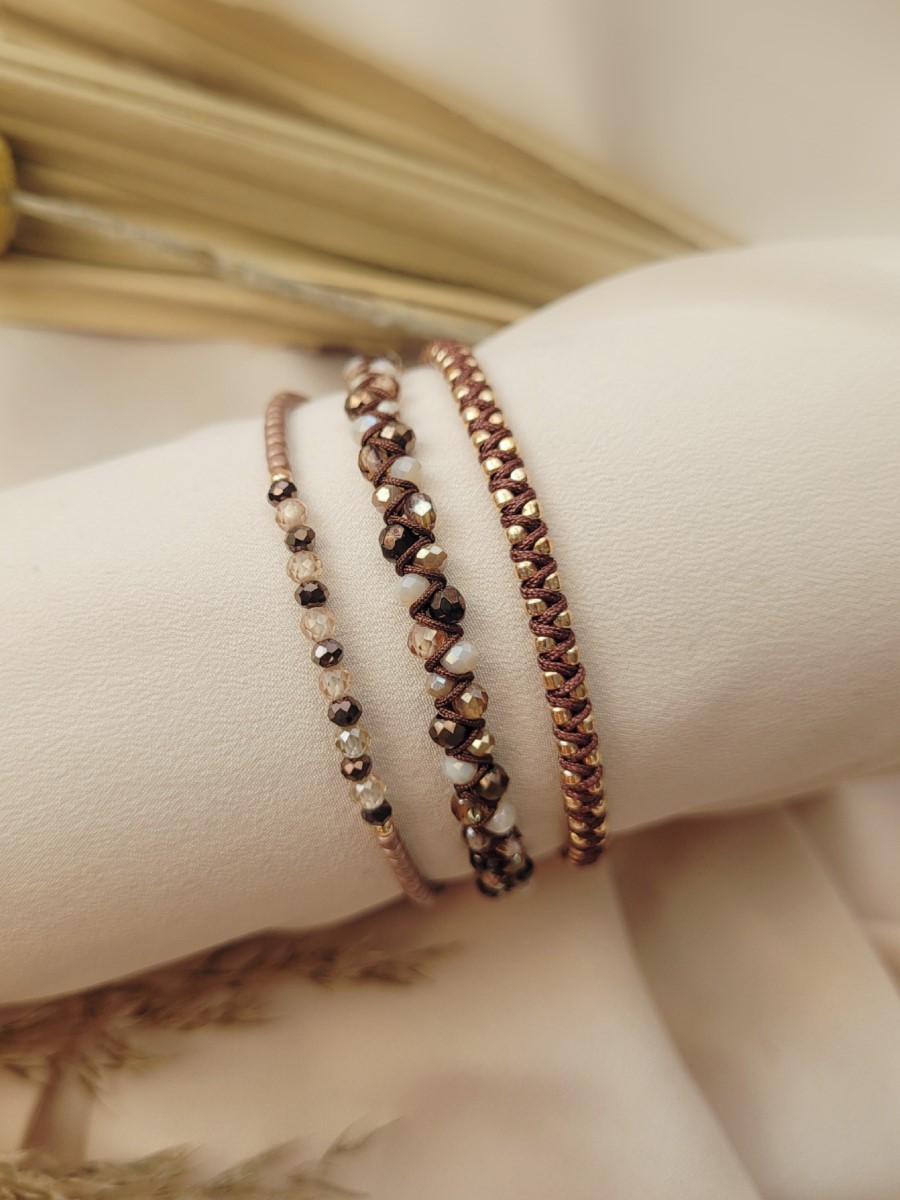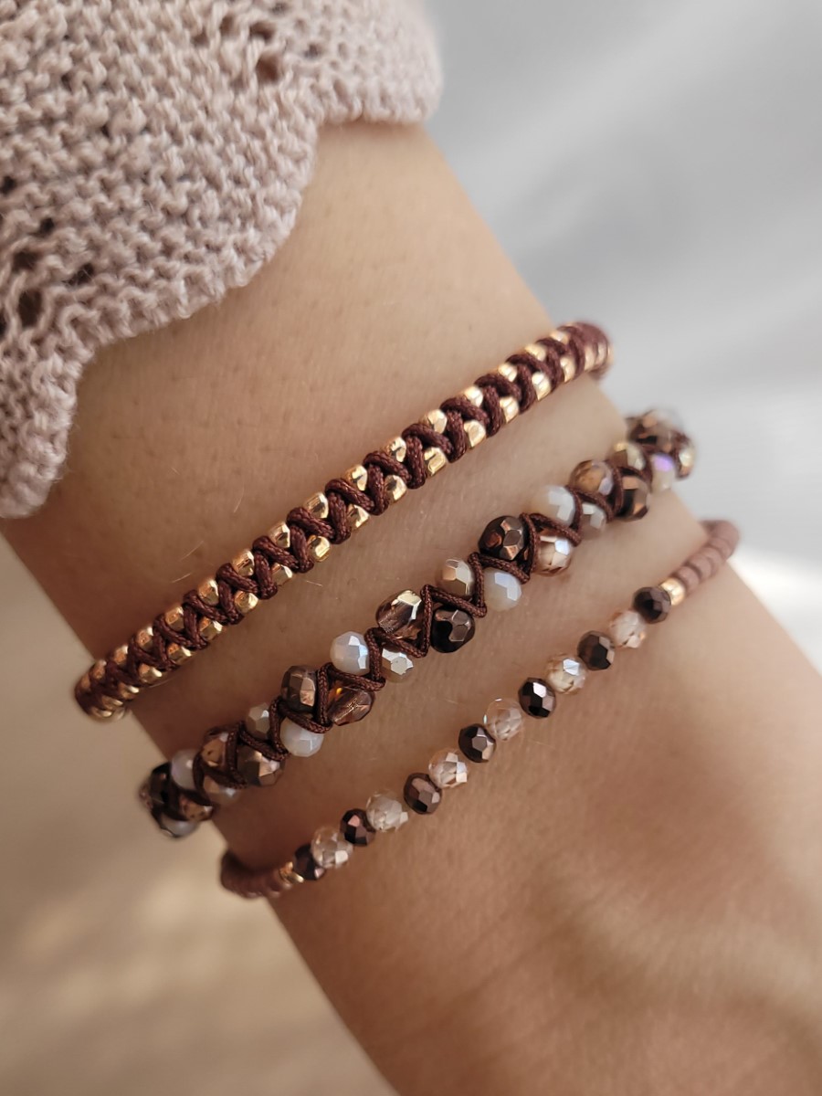 Pierwsza z nich to plecionka durzędowa wykonana z kryształków, koralików czeskich oraz cyrkonii, która nadaje całości oryginalnego wyglądu. Druga to bransoletka pleciona w całości ze złotych koralików toho ( w kolorze rose gold), pięknie rozświetla całość. Trzeci wzór, to mini bransoletka z japońskich koralików TOHOw czekoldowym odcieniu, której centralną część zdobią kremowe cyrkonie oraz brązowe kryształki. Ten detal przyciąga uwagę i dodaje całości uroku. Zestaw wykonany jest na brązowych sznurkach i posiada regulację, co pozwala dopasować bransoletki do nadgarstka.