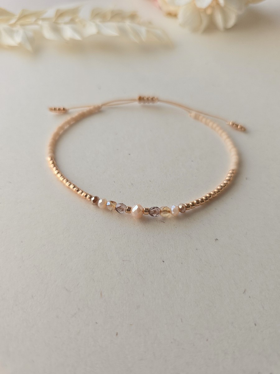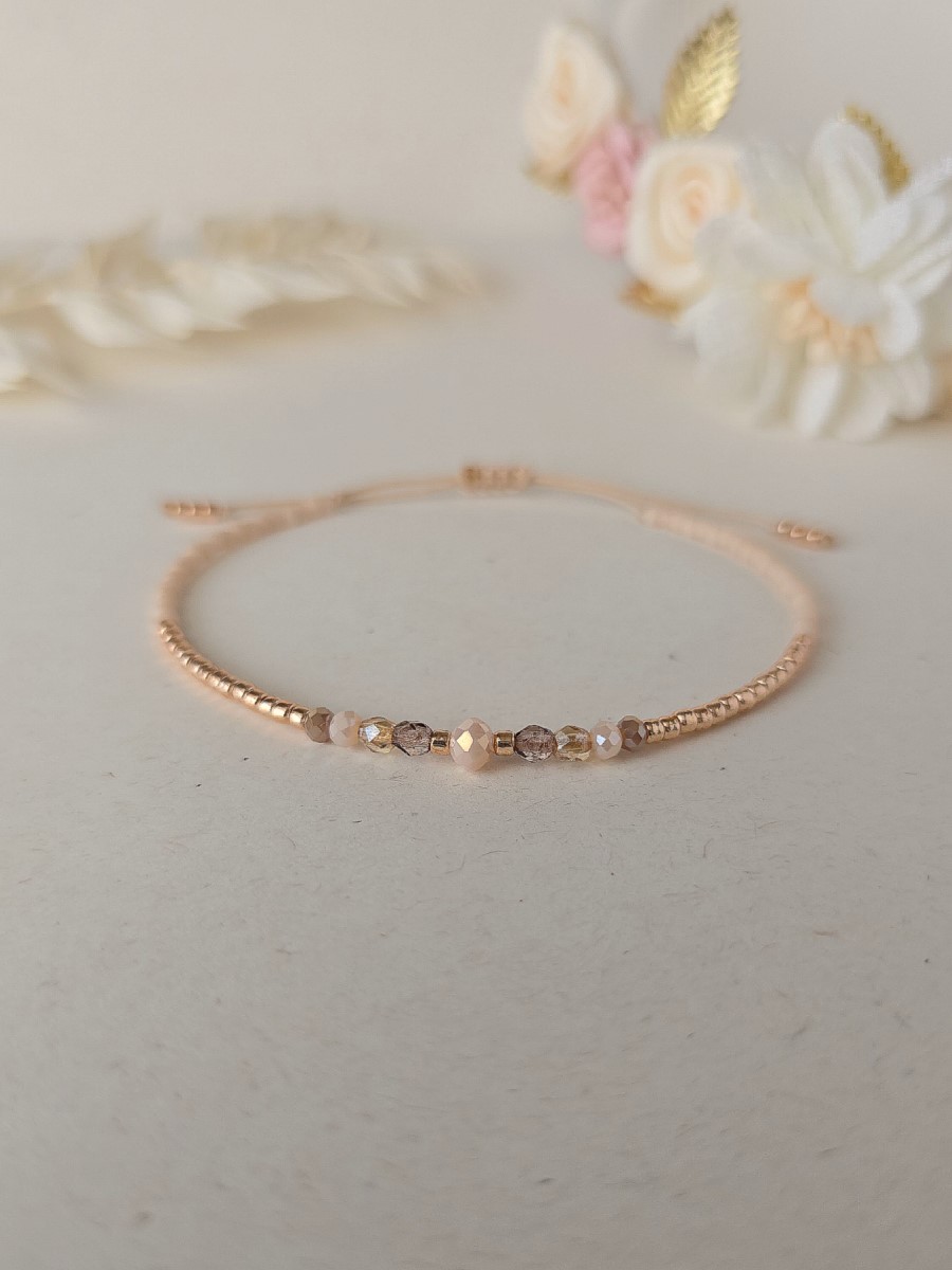 Bransoletka powstała z połączenia drobnych koralików toho w kolorze kremowym i złotym oraz kryształków szklanych i czeskich koralików znajdujących się w centralnej części bransoletki. Starannie dobrana paleta kremowych, beżowych oraz bursztynowo-brązowych tonów nadaje jej ciepły, harmonijny charakter i podkreśla delikatny klimat boho