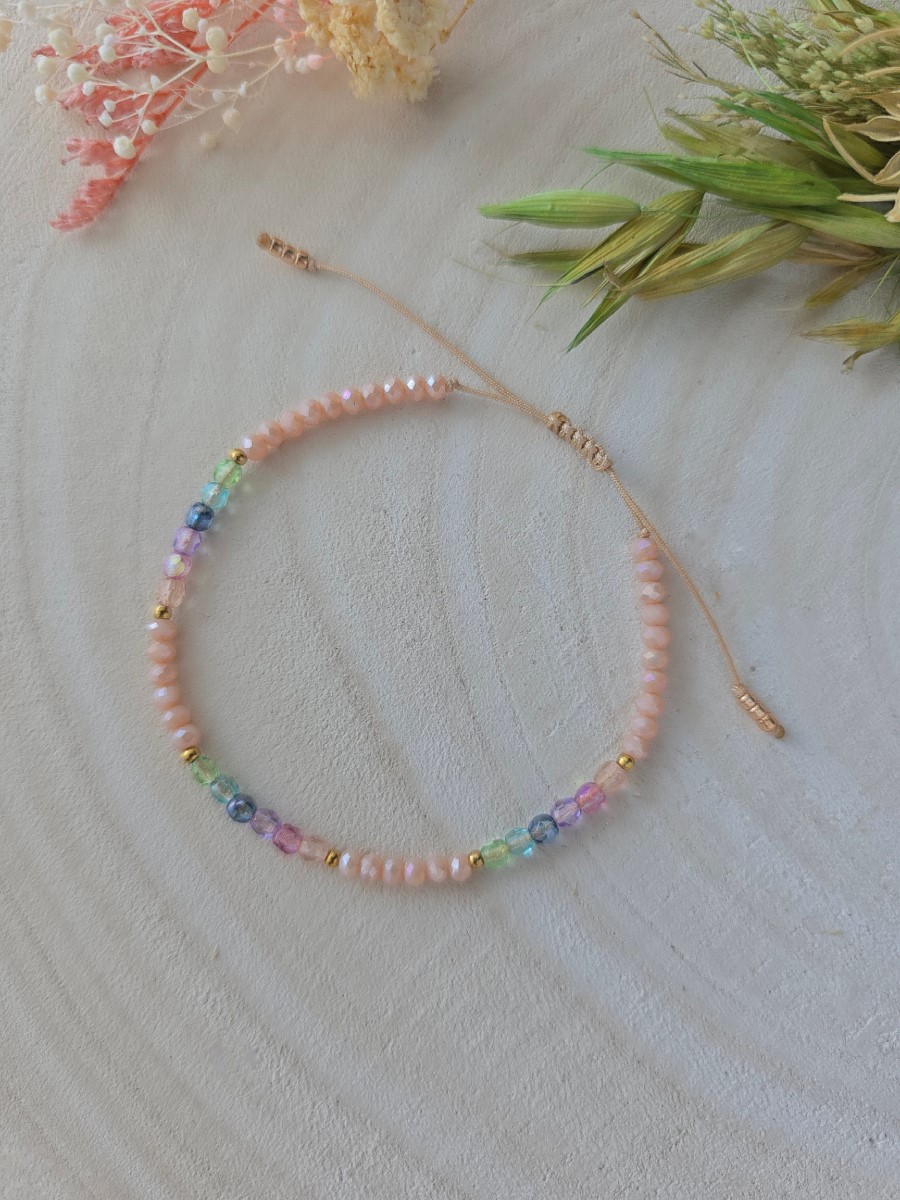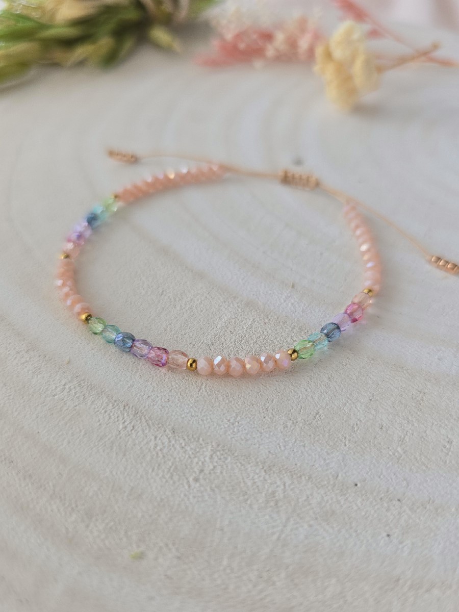 Mini bransoletka Floral, to połączenie delikatności i koloru, inspirowane wiosennym klimatem. Bazę stanowią kremowe, subtelnie połyskujące kryształki, które tworzą spokojne tło dla trzech kolorowych paneli s koralików czeskich.. Kolorowe akcenty w odcieniach zieleni, błękitu, fioletu i różu przyciągają wzrok i nadają całości świeżość oraz lekkość. To właśnie one sprawiają, że bransoletka wyróżnia się, jednocześnie pozostając bardzo uniwersalną i łatwą do stylizacji. Złote kuleczki w trwałym wykończeniu PVD dodają biżuterii eleganckiego blasku i podkreślają jej dopracowany charakter. Całość została wykonana na beżowym sznurku, który pięknie współgra z jasną kolorystyką i nadaje bransoletce naturalnego, subtelnego wyglądu. Świetnie sprawdzi się jako dodatek do lekkich, wiosennych stylizacji, ale równie dobrze podkreśli codzienny look przez cały rok.